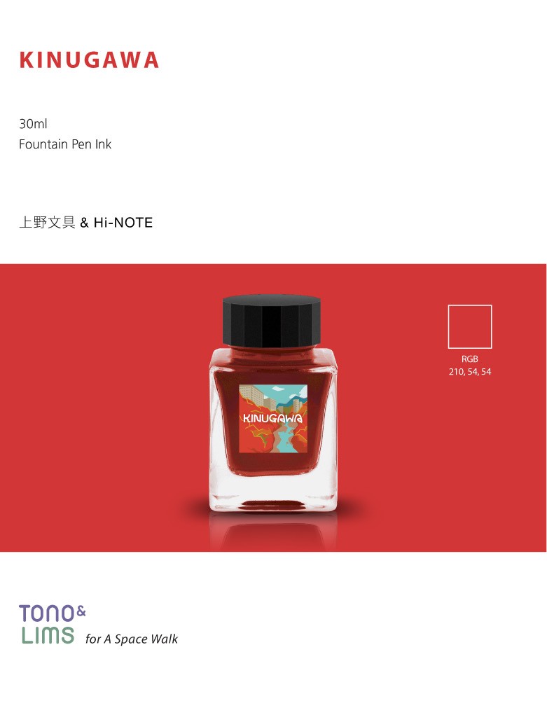 今回は群馬県の文具店Hi-NOTE様とのコラボレーション・インク『温泉インク 旅シリーズ』の1色として参加、カラーは栃木県の名所・鬼怒川温泉をテーマとし、「鬼が怒る」様と真っ赤に色づく紅葉をイメージした趣のある深いレッドで調色しました。