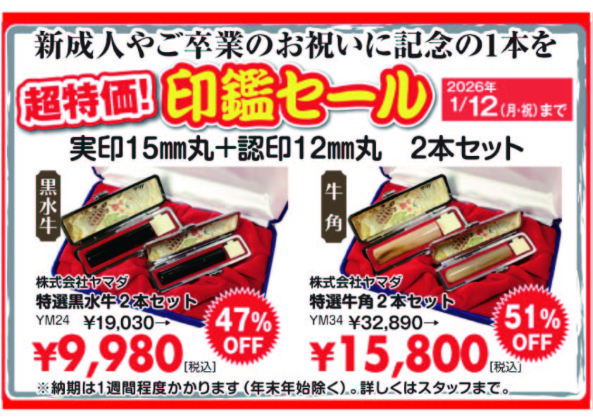 新成人・新社会人となる皆さまへの応援として、1/12(月・祝まで)印鑑セールを開催中です。
